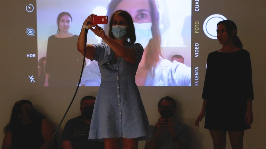 Visage (2021) uses text and song to consider screens, longing, love, distance, and finding oneself in the face of another. Referencing common pandemic-era communication technology in which one is constantly confronted with one’s own image, I use a projector and my phone camera to produce images of the audience watching themselves watching me watching them and so on. Video feedback then becomes a site for contemplation of the never-ending human cycle of connection and loss.