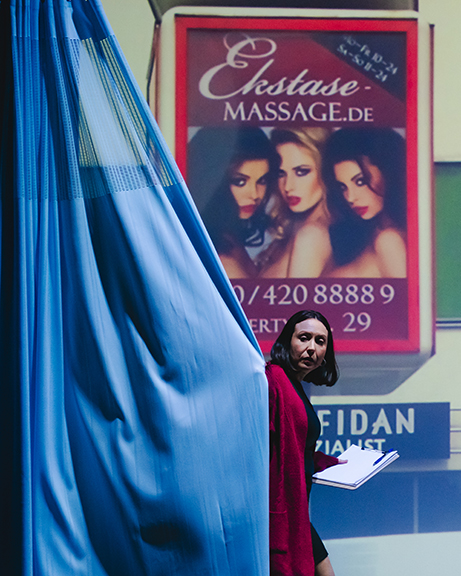 “The trick narratives Barbosa Landois has collected and curated, performed live, are some powerful hoodoo, and present us with nowhere near the agitprop they would’ve in lesser hands. Barbosa Landois unmoors these male utterances from both an expected social context, and from a strictly-punitive gaze. You can feel the artist’s bewildered exasperation with the U.S.-side ‘johns,’ even as she allows them an utterly human-scale and vulnerable voice through Sanden’s performances of the short monologues, and, amazingly, through her own portrayal of these boys, delivered deadpan and uncaricatured.”