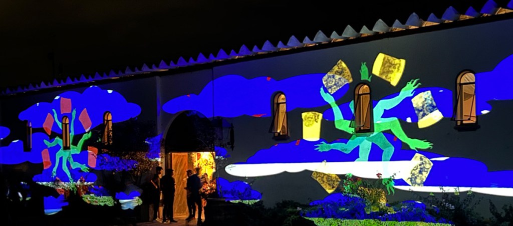 Cloud Bailing (2022) was a site-specific projection created during the Contemplamos Residencia Familiar at ContemploMX in San Miguel de Allende, Mexico. The piece combined layers of cut paper animations with found sound from radio aporee ::: maps. The piece was screened during the Viñedo Dos Búhos annual vendimia (grape harvest) celebration.